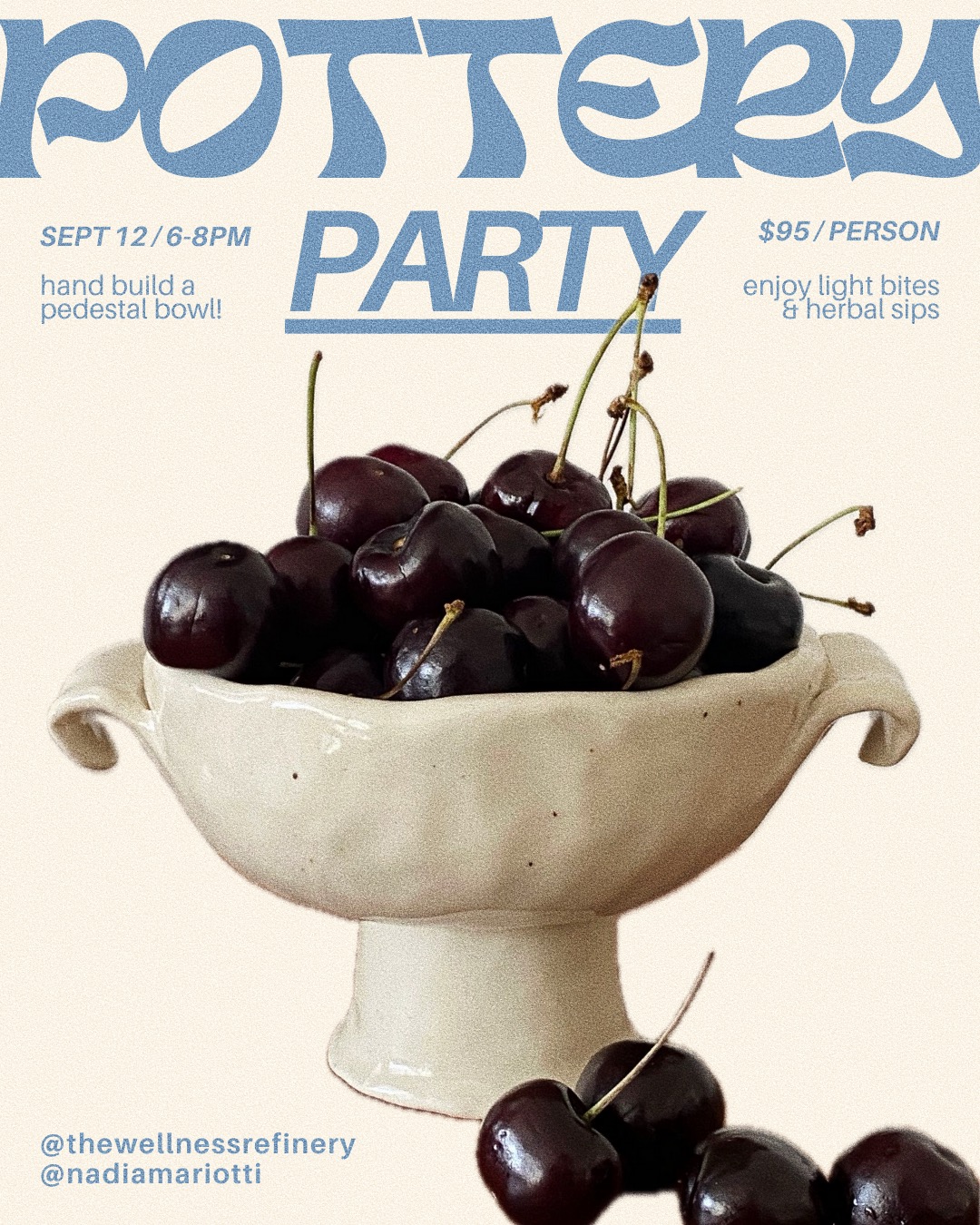 Our hands are back in the clay!! Join us for the next round of our Pottery Party. In this second workshop of our new themed series, you’ll be guided by local ceramic artist Nadia Mariotti in creating your very own pedestal bowl. It’s a timeless piece that is perfect for parties and gatherings, daily rituals,